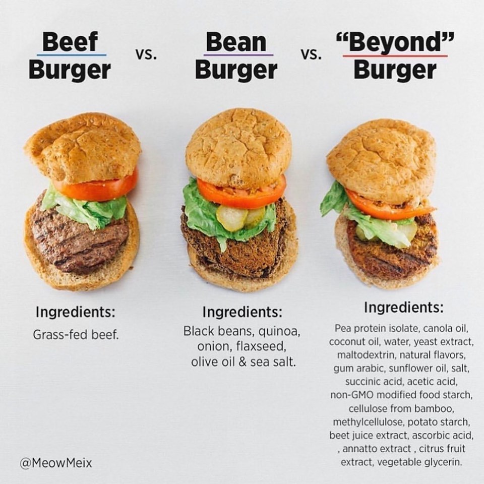 The intent here is twofold: 1. Invoke fear by listing the scary sounding chemical compounds that make up the Beyond Burger and 2. Invoke fear by implying more ingredients is worse for your health.
